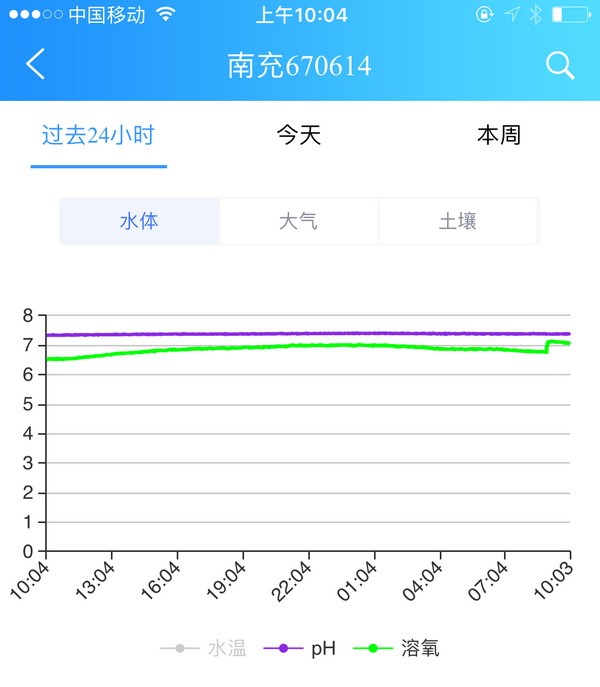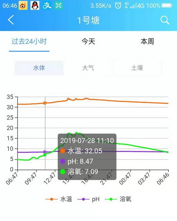 U魚的在線溶氧儀檢測範(fàn)圍為0-20ppm,同時加裝PH探頭。可以同時檢測溫度(dù),PH、溶氧數值。同時有成熟的手機(jī)和電腦端軟件配套。目前以SIM卡作為數據傳輸介質。不管你人在哪裏,隨時都可以通過手機或電腦,檢測水(shuǐ)產養(yǎng)殖池中的水質參數。同時可以通過遠程控製,對增氧設備進行過程控製。一般外(wài)塘(táng)的檢測曲線: